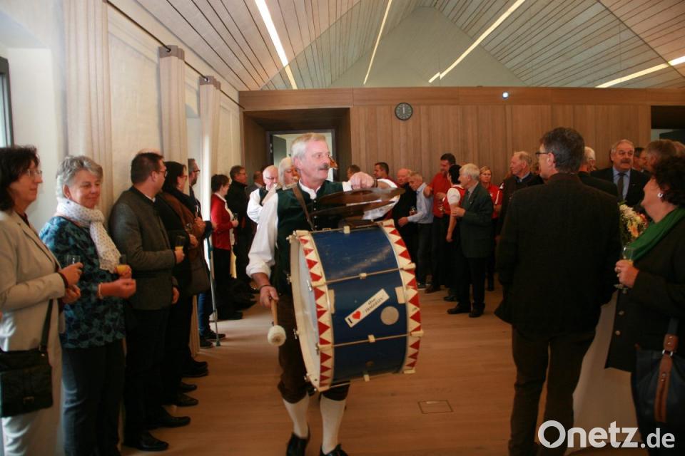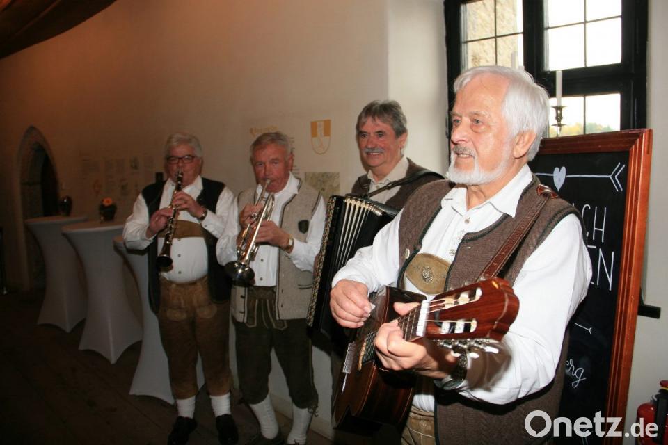Aufgrund des nass-kalten Wetters musste das anschließende Händeschütteln, das eigentlich im Burghof stattfinden sollte, kurzerhand ins Tagungszentrum verlegt werden. Davor wartete bereits die Blaskapelle. Die Instrumente für ihren späteren Auftritt hatte auch die „Falkenberger Zoiglmusik“ vorbereitet. Bürgermeister Herbert Bauer hatte bewusst versucht, den offiziellen Zeitrahmen sehr eng zu stecken. Dennoch reichten je drei Minuten Redezeit nicht aus, um rechtzeitig zur Burg zu kommen, wo im Ritter- und Kapitelsaal bereits die Tische gedeckt waren.