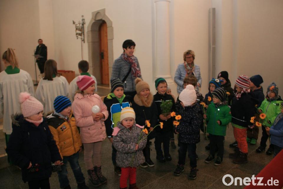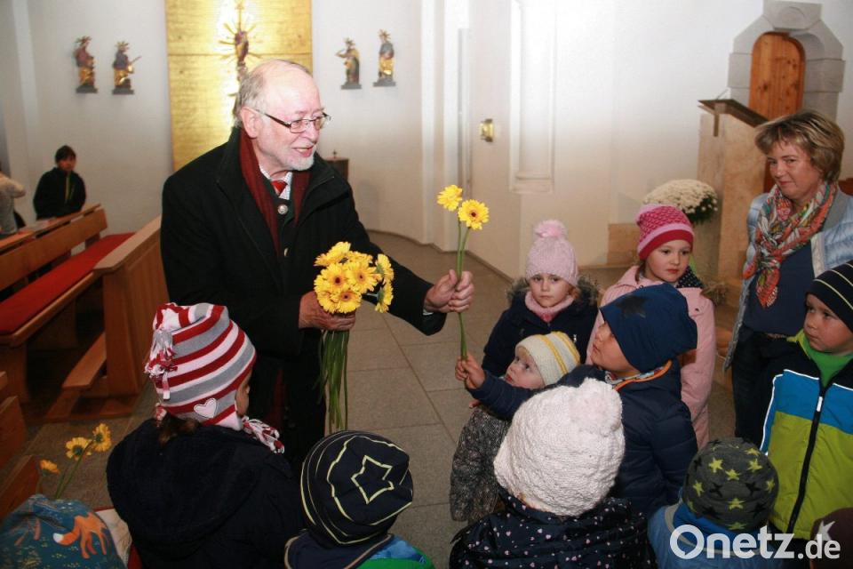 Noch in der Kirche gratulierten die Buben und Mädchen des Kindergartens „Sankt Rita“, die ein Gedicht, Blumen und symbolische Geschenke folgen ließen. Mitgebracht hatten sie auch ein wenig Falkenberger Erde: „Damit du am Boden bleibst“, empfahlen die Kleinen. Den Geduldsfaden, der später folgte, mussten sie nicht näher erklären. „Die Drahtstifte brauchst du, um Nägel mit Köpfen zu machen." Mit je einer Blume und einer Dose Energy-Drink als „Medizin“ gegen Hektik und Stress sagten die Kinder „Happy Birthday“.