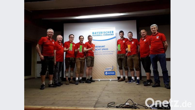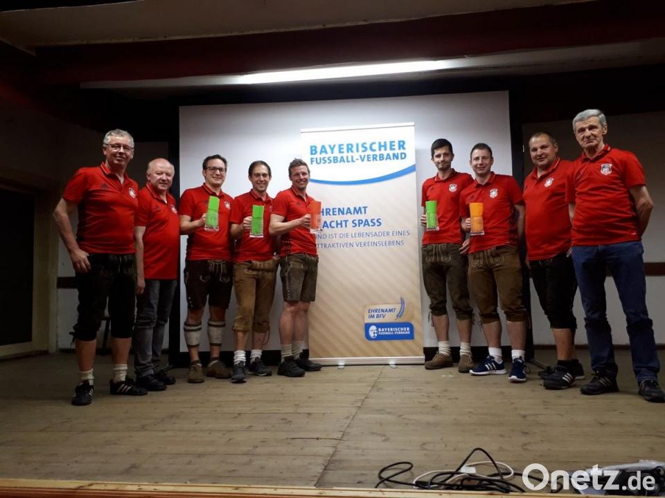Die DJK Falkenberg zeichnete im Rahmen eines Ehrenabends verdiente Spieler für 300, 400 und 500 Spiele in der Herrenmannschaft aus. Für 300 Spiele erhielten Michael Bauer, Ralf Fürnrohr und Johannes Schüner einen gravierten DJK-Krug samt Füllung in Gutscheinform. Bereits über 400 Spiele absolvierte der Kapitän der ersten Mannschaft, Daniel Lindner. Thomas Bitterer bestritt sogar über 500 Spiele für die DJK Falkenberg. Bemerkenswert ist, dass alle Geehrten seit dem Kindesalter ihre Fußballschuhe für die DJK schnüren. Im Bild von links nach rechts DJK-Teammanager Richard Bitterer, erster Vorsitzender Hubert Mark, Michael Bauer, Ralf Fürnrohr, Thomas Bitterer, Johannes Schüner, Daniel Lindner, Fußball-Spartenleiter Michael Gleißner und Mannschaftsbetreuer Günther Griesch. Bild: exb