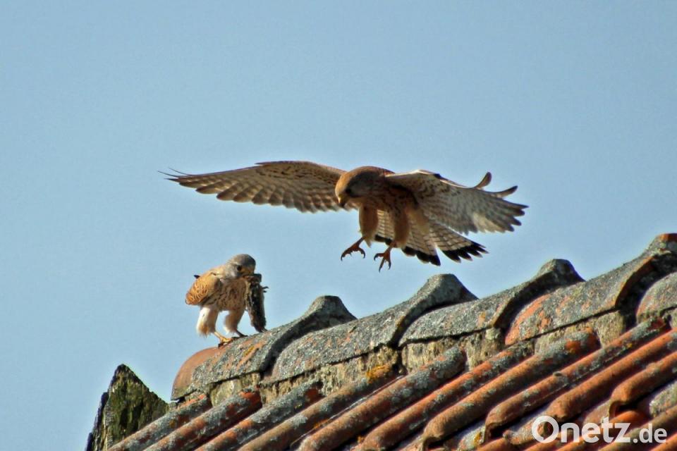 Einer der seltenen Turmfalken sitzt bereits auf einem Schuppendach bei Dürnsrichtermühle (Gemeinde Fensterbach) und hat eine erbeutete Maus dabei. Der andere ist mit breiten Schwingen im Anflug und landet neben dem gefiederten Artgenossen. "Könnte das eine Art Brautgeschenk für den weiblichen Vogel gewesen sein?", fragte sich der aus Wolfring stammende Hobbyfotograf Hans Heimler, nachdem ihm dieser Schnappschuss geglückt war. Turmfalken hatte Heimler vorher noch nie in dieser Gegend gesehen. Wenige Augenblicke nach dieser Szene hoben die Falken samt der Beute ab und verschwanden.