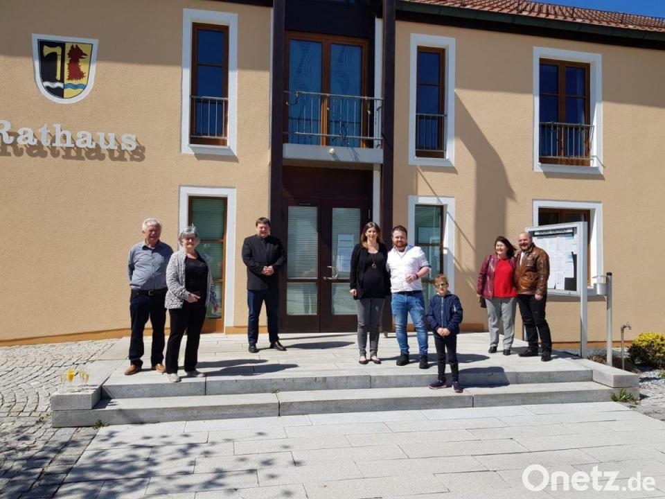 Draußen vor dem Rathaus kam es zu einem Erinnerungsbild. Auch das wird einen dauerhaften Platz in der Gemeindechronik finden. Außerdem werden es sich wohl alle diejenigen aufheben, die wegen strenger Pandemie-Regeln nicht als Gäste an der Eheschließung teilnehmen konnten.