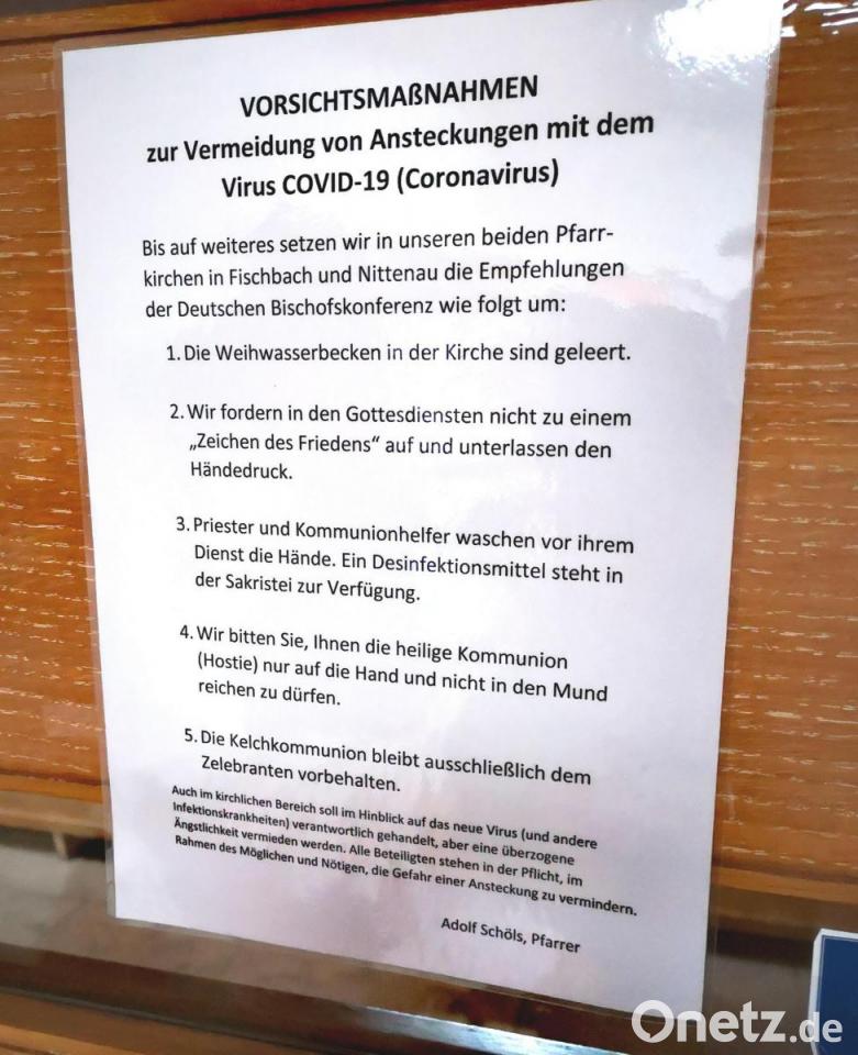 Die Pfarreien haben seit geraumer Zeit auch Hygiene-Regeln ausgedruckt und an den Kirchentüren aufgehängt. Dazu gehört auch, dass die Weihwasserbecken in den Kirchen geleert wurden und schon bisher unter anderem "Friedensgruß" und Händedruck in der Messe zu unterbleiben hatten.