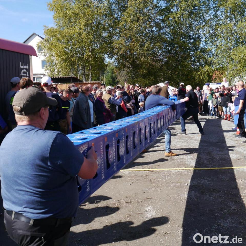 Am Ende des kuriosen Wettbewerbs am Sonntag im Rahmen des Fichtelberger Oktoberfests hielt die Siegermannschaft, der Schützenverein Hüttstadl-St. Veit, (Gemeinde Fichtelberg) 50 Kisten. Eine grandiose Leistung. Der Weltrekord liegt bei 63. Zweimal hatten die Hüttstadler mit Unmengen an leeren Kästen trainiert, wie Mitglieder verrieten, die Flaschen derweil in der Küche des Schützenhauses deponiert. Und die Mühe hat sich gelohnt. Jetzt dürfen sie sich über 50 Liter Bier freuen.