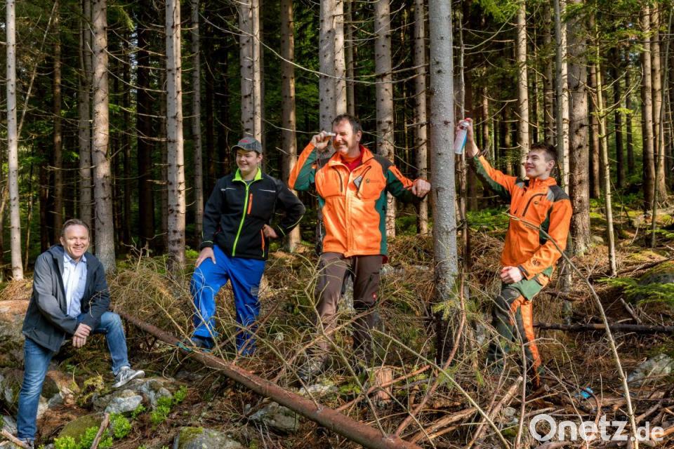 Gemeinsam den Auszubildenden des Forstbetriebs kletterte Florian Völkl im Wald am Ochsenkopf über Felsen und umgebrochene Baumstämme. Dabei legten sie Schneisen im Wald an und markierten vom Borkenkäfer befallene Bäume, die später gefällt werden und Platz machen für neue Bäume – eine anstrengende, aber auch lehrreicher Tag für Florian und zugleich eine tolle Hilfsaktion für Bedürftige in Afrika.