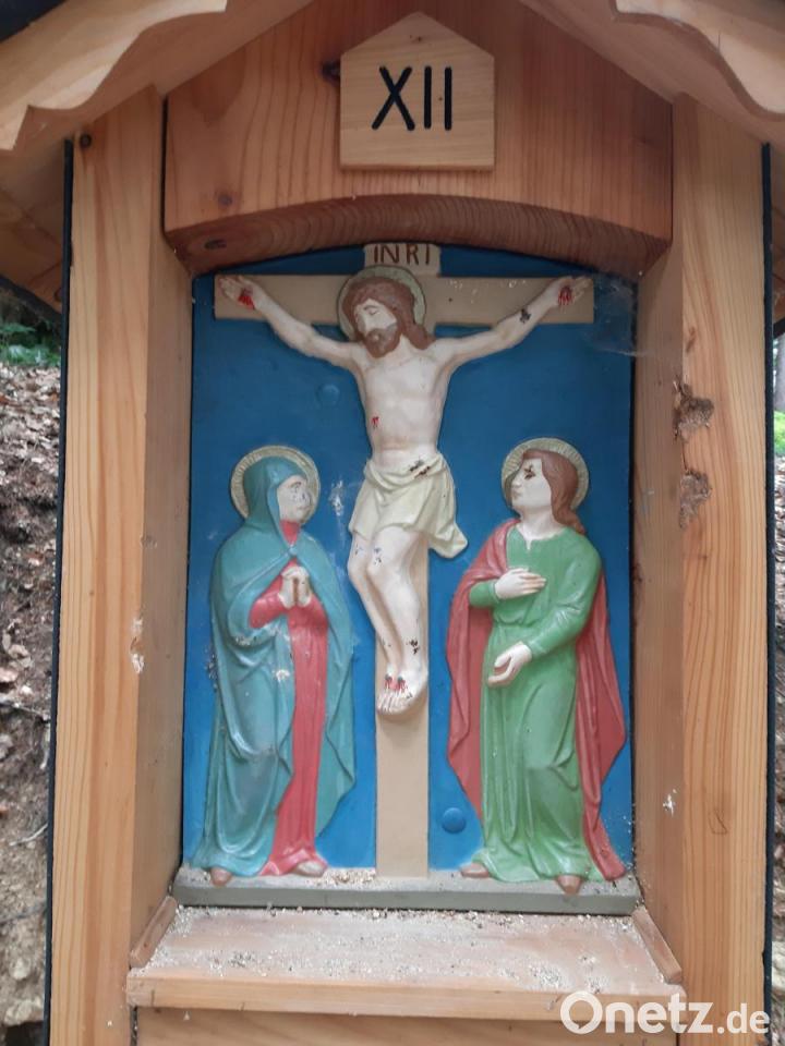 Der Kreuzweg am Kalvarienberg ist ein sehr beliebtes Ziel, nicht nur der einheimischen Bevölkerung, die angetan ist von der Gestaltung der 14 Stationen. Sie berühren in beeindruckender, künstlersicher Einfachheit und laden zum Verweilen und zum Gebet ein – verbunden mit großer Bewunderung, Lob und Respekt für Armin Hofmann aus Neubau, der dieses religiöses Kunstwerk geschaffen hat. Jetzt waren Vandalen am Werk, haben einige der Tafeln mit Steinen beworfen und die Figuren so sehr beschädigt, dass sie nur mit großem Arbeitsaufwand wieder renoviert werden können.