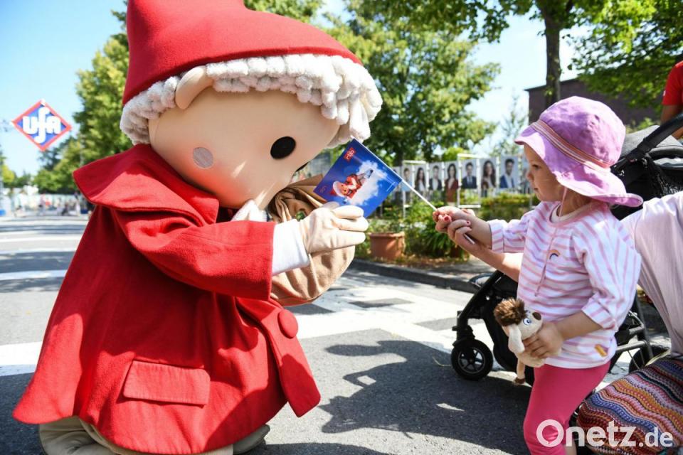 Kinder hatten sich als Sandmännchen verkleidet. Sie erhielten freien Eintritt in den Filmpark. Wie viele Besucher zum Geburtstagsfest kamen, wollte der Park am Sonntag bekannt geben. Bei der großen Geburtstagsshow gratulierten bekannte Freunde der Trickfilm-Puppe, darunter Rabe Socke, Shaun das Schaf und der Ohrenbär.