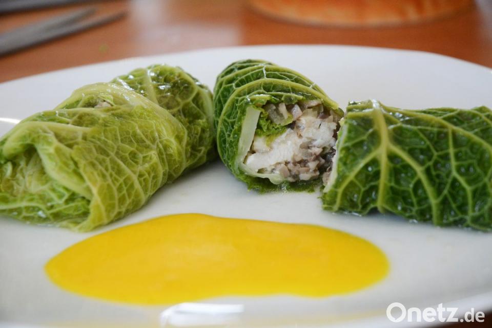 Die Kohlköpfe waschen und 16 schöne, große Blätter ablösen. Die Blätter zirka zwei Minuten in kochendem Salzwasser blanchieren. Gut abtropfen lassen und auf der Arbeitsfläche auslegen. Die dicken Mittelstrünke mit einem Messer abflachen. Die Kohlblätter gründlich abtrocknen.