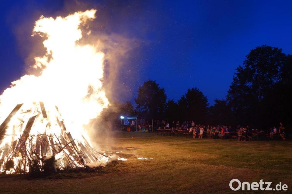 Nachdem die Mädchen und Buben mit Fackeln das Feuer entzündet hatten, loderten schnell hohe Flammen in den Nachthimmel. Aktive der Feuerwehr standen mit dem Löschfahrzeug parat und bewässerten das direkte Umfeld der Feuerstelle.