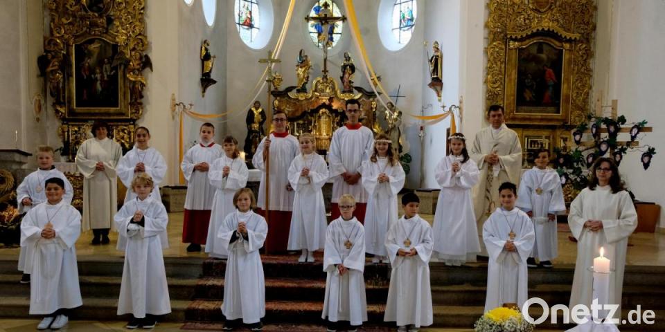 13 Kinder feierten in Floß Erstkommunion. Der Festtag stand unter dem Gotteswort „Ich bin der Weinstock – ihr seid die Reben". Unter feierlichem Glockengeläut bewegte sich vom Pfarrheim ein langer Kirchenzug mit Kreuz, Erstkommunikanten, Ministranten, Kommunionhelfer und Pfarrer ins festlich geschmückte Gotteshaus. Einzug und Festgottesdienst bereicherten Felicia Krauß und Florian Schieder (Orgel) sowie der Kinder- und Jugendchor unter Leitung von Marion Elling. Begleitet wurden die Kinder von Rektor Gerhard Steiner und Klassenlehrerin Tanja Kastl. Pfarrer Max Früchtl rief den Kinder zu: „Jetzt ist er da. Der große festliche Tag. Das einmalige Erlebnis." Die Kinder bat er, mit Jesus, dem guten Hirten, durchs Leben zu gehen. Pfarrer Früchtl überreichte jedem Kind ein gesegnetes Kreuz, während die Gläubigen in das Lied „Fest soll mein Taufbund immer stehen" einstimmten. Die Mädchen und Buben scharten sich um den geschmückten Altar. Daneben ein großer Weinstock, an dem die Bildern der Kommunionkinder angebracht waren. Höhepunkt war schließlich der Empfang der ersten heiligen Kommunion.