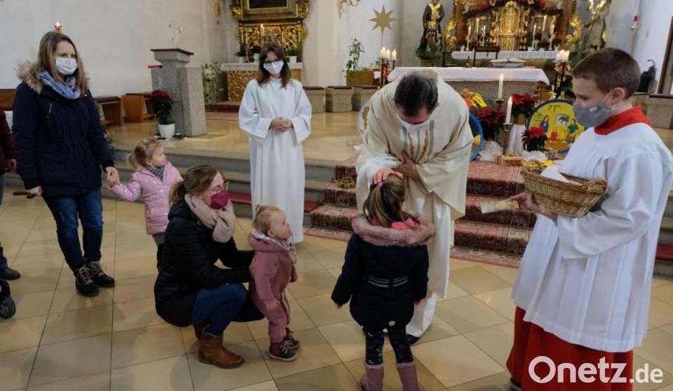 „Kommen Sie mit ihrer Familie. Jedes Kind wird gesegnet." So hatte Pfarrer Max Früchtl im Pfarrbrief zum „Fest der Heiligen Familie" am Sonntag eingeladen. Viele Eltern kamen mit ihrem Nachwuchs in die Kirche. Zum Ende des festlichen Gottesdienstes versammelten sich die Kinder mit ihren Eltern an den Stufen des Altars neben dem Christbaum und der Krippe. Pfarrer Früchtl segnete jedes Kind und hatte für die kleine Knirpse aufmunternde Wort übrig. Als Dankeschön für die Teilnahme an der Eucharistie überreichte der Pfarrer jedem Kind ein Bildgeschenk. Den musikalischen Teil des Festgottesdienstes gestaltete Martin Wölfel (Orgel und Gesang).