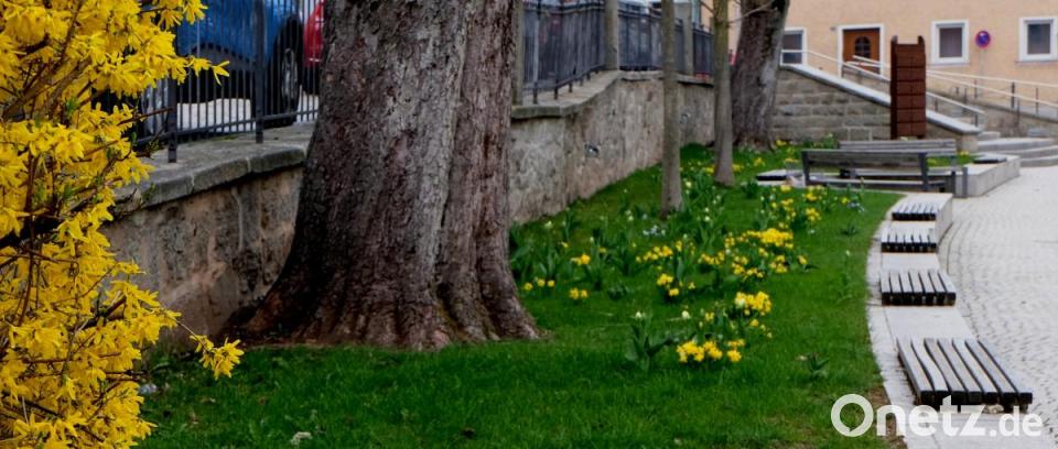 Helfer hatten im Herbst 800 Blumenzwiebeln entlang der Granitmauer der Marktplatzanlage und unmittelbar am neu geschaffenen Rundell mit Sitzbänken gesteckt. Die bislang kahle Fläche leuchtet jetzt durch die unzählig aufblühenden Frühlingsboten.