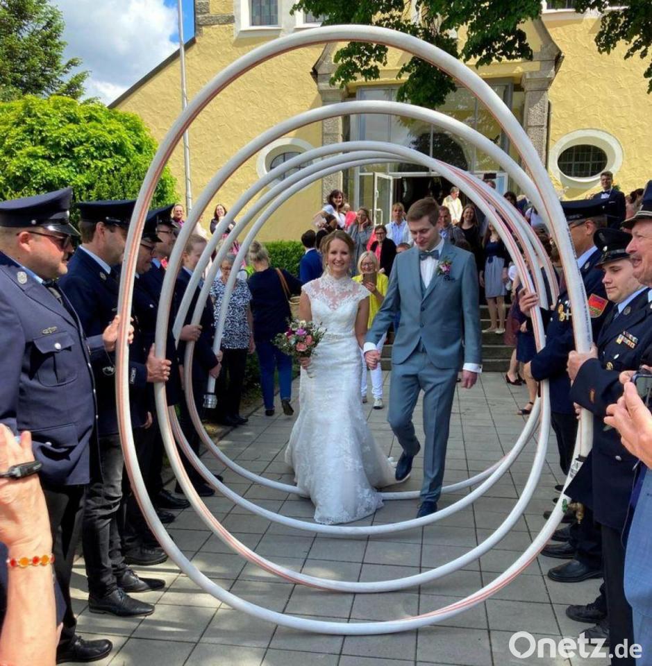 Noch bevor die Jungvermählten in das Brautauto von Hans Fischer steigen konnten, versammelte sich eine große Gratulantenschar um sie herum. Unter ihnen waren die Kameraden der Feuerwehr Plößberg, die Sirenen aufheulen ließen, Vertreter des TV Floß, die Flosser CAJ-Gruppe und Kollegen des Bräutigams von der Volksbank Raiffeisenbank Nordoberpfalz. Angeschlossen hat sich der Cylinderclub Floß mit Noah Lugert.