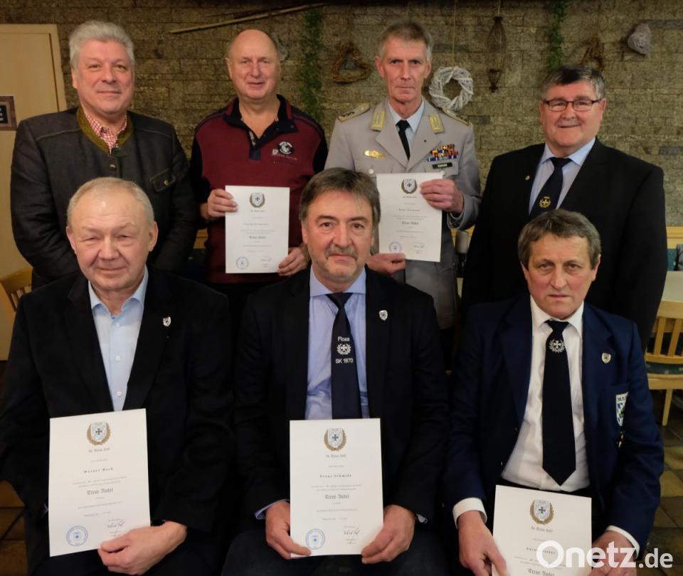 Keine Jahreshauptversammlung der Soldatenkameradschaft 1870 ohne Ehrungen langjähriger Mitglieder. Diese Freude drückten Vorsitzender Hans Eismann und Kreisvorsitzender Heinrich Scheidler aus, als sie Ehrennadeln und Ehrenurkunden im Namen des Bayerischen Soldatenbundes überreichten. Der Wahlspruch "In Treue fest" sei von allen Jubilaren umgesetzt worden. Auch Bürgermeister Günter Stich und der Kreisvorsitzender Heinrich Scheidler gratulierten. Ausgezeichnet wurden: 10 Jahre: Hans Eismann und Werner Bock. 25 Jahre: Manfred Bäuml, Franz Schmidt und Georg Zscherner. 40 Jahre: Josef Lindner und Anton Saller.