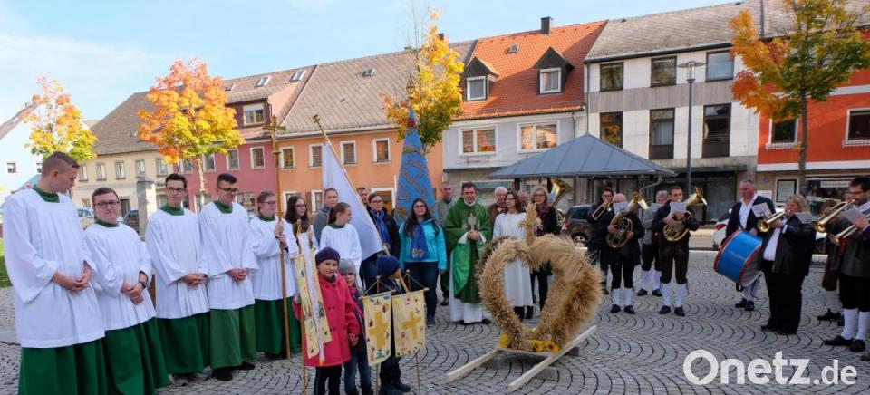 Bereits gegen 9.30 Uhr versammelten sich am Marktplatz eine viele Gläubige mit Standarten- und Fahnenabordnungen zum Kirchenzug. Einige Tage vorher war das Team um Leiterin Marlene Noetzel vom Seniorenkreis mit der Gestaltung der neuen Erntekrone beschäftigt. Ihren festen Platz fand sie am wunderschön gestalteten Altar, wofür Früchtl herzlich dankte.