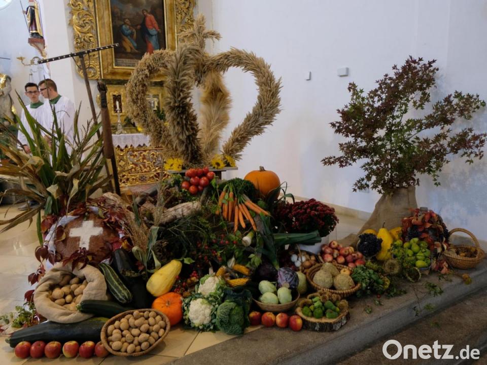 Höhepunkt war die vom Seniorenkreis und der Flossenbürger Blaskapelle gestaltete Eucharistiefeier mit Pfarrer Max Früchtl, der den prächtigen, mit viel Obst- und Gemüse, Blumen und Sträuchern geschmückten Erntealtar samt Krone segnete.