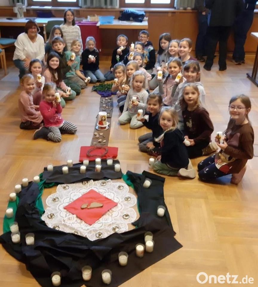 Das Kinder-Kirchenteam mit Christina Schaller, Christine Sailer und Andrea Mutterer erstmals zu einem Kinder- und Familienkreuzweg im Pfarrheim St. Josef eingeladen. Über 25 Kinder, dazu Eltern und Angehörige, waren gekommen um zu beten, zu singen und den letzten Weg Jesu zu betrachten. Der Fußboden war mit Tüchern und Kerzen, einem steinigen Weg, Krone und Kreuz geschmückt und faszinierte Groß und Klein.