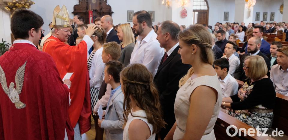 Freihat war zum ersten Mal in Floß. Er hieß die Firmlinge nicht wie in Jahrzehnten zuvor im Pfarrsaal, sondern auf dem Marktplatz willkommen. Die musikalische Gestaltung des Festgottesdienstes übernahm der Jugendchor unter Leitung von Marion Elling.
