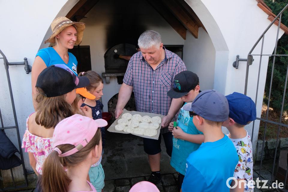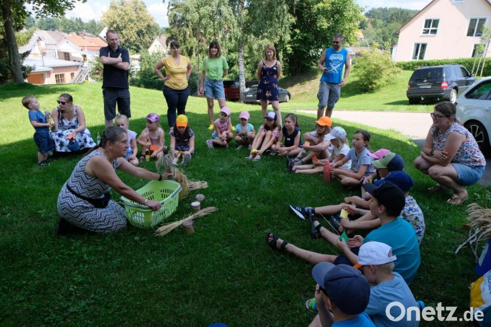 Leiterin Katja Kreuzer freute sich über 20 kleine Teilnehmer und viele Helfer. Bäuerin Sigrid Strobel aus Haupertsreuth hatte verschiedene Getreidesorten für die Kinder mitgebracht. Vom Säen bis zum Ernten der Frucht, vom Mahlen des Getreides bis zum Kneten des Brotteigs reichten ihre Erzählungen. Höhepunkt war das Backen der kleinen Brotlaibe im Holzbackofen des Waldvereins. Zudem gab es viele Spielemöglichkeiten im Schatten des Rathausplatzes geboten. Auch die Eltern durften später dazukommen.