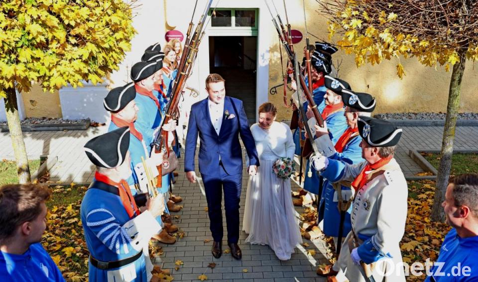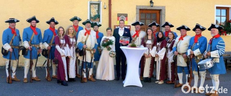 Das hat es schon lange nicht mehr bei der Flosser Landwehr gegeben. Einer der jungen Aktiven hat geheiratet. Der Flosser Bauzeichner Simon Schaller und die aus Neustadt/WN stammende Angestellte Teresa Sailer gaben sich am Samstag auf dem Standesamt vor Bürgermeister Robert Lindner das Jawort. Grund genug für die Landwehr, Segenswünsche zu überbringen. Nach der Trauung, die im Alten Pflegschloss stattfand, stand die Landwehr in historischer Uniform und Ausrüstung Spalier. Kommandant und Vorsitzender Franz Schmidt und seine beiden Stellvertreter Manfred Bäuml und Willy Hirsch gratulierten mit Blumen, Bild und Hochzeitskarte. Zudem rummste ein kräftiger Ehren- und Gruppensalut über den Platz. Gratulationen kamen auch von Kollegen und Abordnungen des SV Floß und des Nürnberger Fanclubs. Das Paar hat seinen Wohnsitz in Floß.