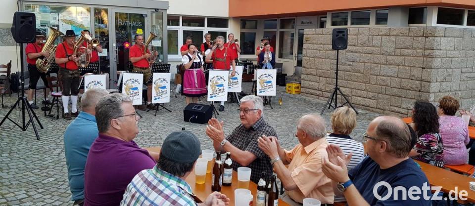 Mit fast zwei Stunden Musik aus dem Nachbarland bildeten sie den Auftakt der diesjährigen Flosser Sommer-Serenaden. Mehr als 100 Gäste, darunter auch viele auswärtige Musikinteressierte, waren der Einladung gefolgt und konnten in der "Böhmischen Stund" bekannte Blasmusik miterleben. Sogar einige Radfahrer legten eine „musikalische Pause“ ein. Mit dem „Andulka Marsch“ und einem „Mosch-Medley“ erklangen pünktlich um 19 Uhr die ersten Töne der Kapelle, unter Leitung von Arne Mack. Sängerin und Moderatorin Brigitte Beer führte in ihrer gewohnt heiteren Art durch das Programm. Die Umrahmung der Musikstücke mit heiteren Geschichten und Witzen begeisterte das Publikum. Gemeinsam bildete sie mit Harald Faltenbacher ein Gesangsduett, das stimmlich überzeugte und das Publikum bezauberte. Der Vorplatz des Rathauses bildete die perfekte Kulisse für die Polkas und Märsche verschiedener böhmischer Komponisten.