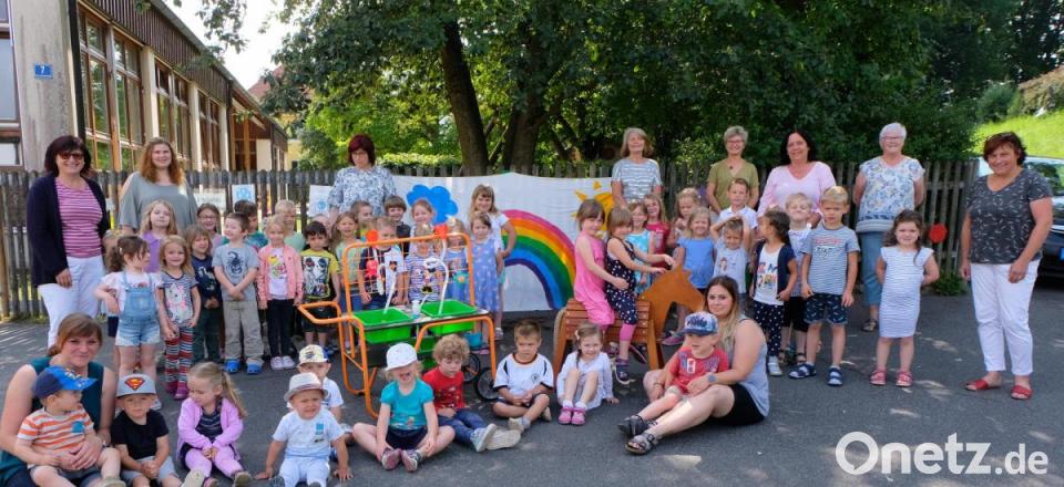Die Kleinen des Katholischen Kindergartens St. Johannes Maria Vianney konnten sich nicht satt sehen am Geschenk des Katholischen Frauenbundes, der einen Wasserspielplatz und ein kräftiges Holzpferd mitbrachte. Für Zweite Vorsitzende Renate Bock mit ihren Begleiterinnen Renate Beierl und Ingrid Lindner eine angenehme Aufgabe, den Kindern diese Geschenke übergeben zu dürfen. Es waren die Erlöse aus dem letzten Bürgerfest und dem Pfarrfest der Kirchengemeinde. Immerhin über 600 Euro, die für diese Spielgeräte der Kinder investiert wurden. Und damit reiht sich die hochherzige Spende an die der vergangenen Jahre ein. Der Frauenbund stellte bereits Tische und Bänke sowie eine Schaukel zur Verfügung. Leiterin Agnes Schwarzmeier, sie war mit ihrem Team vertreten, lobte diese reichen Gaben und meinte: „Wir können nicht genug danken. Ihr seid doch die besten Frauen." Die Kinder drängelten förmlich, um auf dem Holzpferd sitzen zu dürfen. Ihre Freude brachten die Kleinen spontan mit einem kräftigen „Ihr seid einfach Spitze" zum Ausdruck.