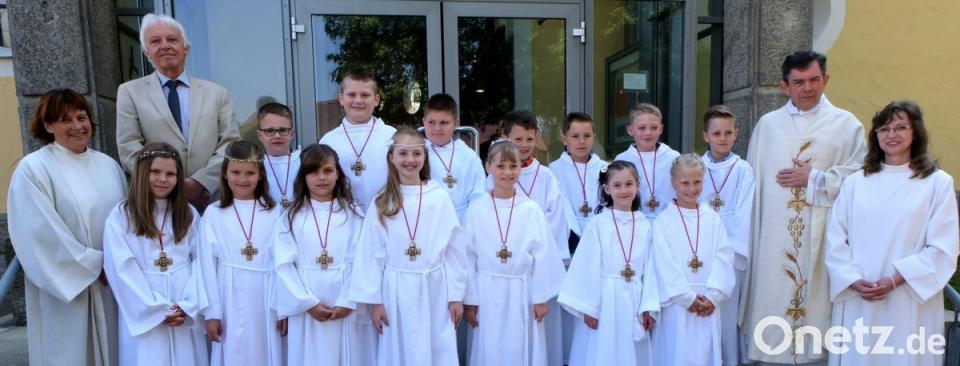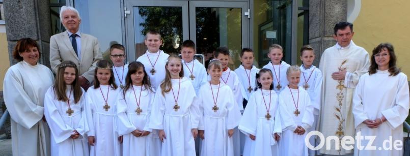 Den Leib Christi haben acht Mädchen und sechs Buben am Sonntag in ihrer Heimatkirche St. Johannes der Täufer empfangen. Bei den Vorbereitungen hatten sich Christina Schaller und Elisabeth Lehner und viele Tischmütter engagiert. Vom Pfarrheim St. Josef bewegte sich der Kirchenzug ins festlich geschmückte und vollbesetzte Gotteshaus, wo er durch die Orgelklänge von Florian Löw begrüßt wurde. musikalische Gestaltung übernahmen die "Kirchenmäuse" und der Kinder- und Jugendchor unter Leitung von Marion Elling. Begleitet wurden die Kinder von Rektor Peter Steigner. Statt einer Predigt führte Pfarrer Früchtl einen Dialog mit den Kindern. Er bat die Kinder, mit Jesus dem guten Hirten, durchs Leben zu gehen. Im Kreis um den Altar beteten die Kommunionkinder Melissa Scherer, Dominik Jakob, Jonas Lehner, Ronja Schütz, Lena Hör, Tim Witzl, Laura Barth, Lena Schenk, Tomino Hacker, Lea Przetak, Alexander Maliszeck, Marie Lugert, Benjamin Bauer und Simon Richter das Vater unser. Bild: le