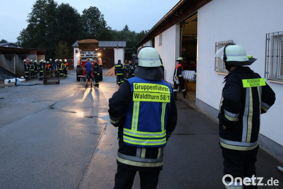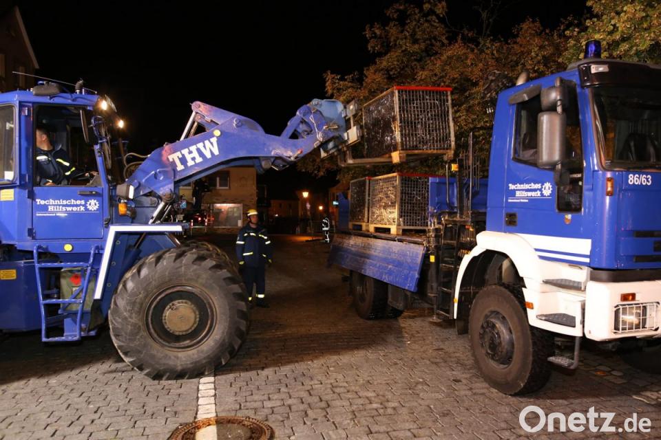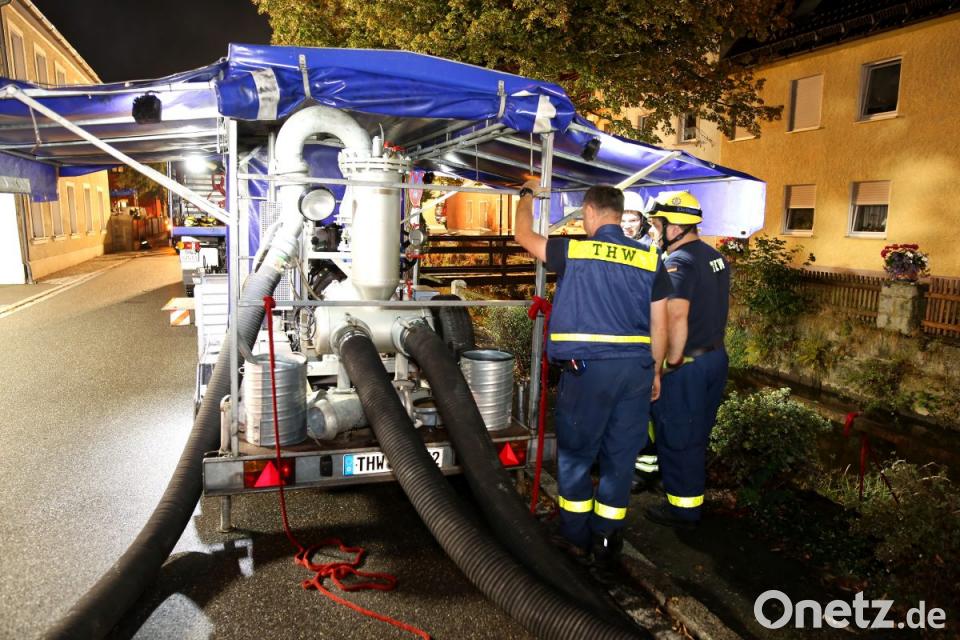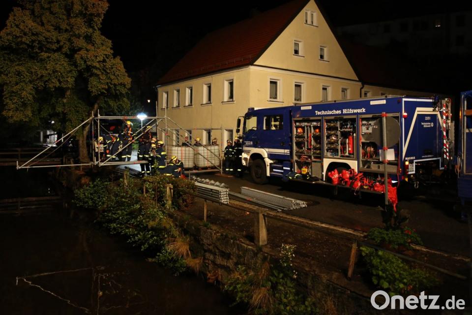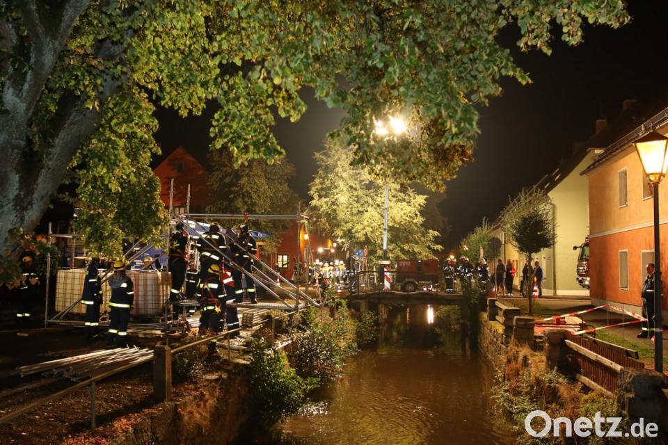 Viel Aufmerksamkeit erregte der Bau eines behelfsmäßigen Übergangs über die "Floß". Gekonnt und fast schon akrobatisch entstand eine Brücke von einer Uferseite zur anderen. Unterdessen kam eine Großpumpe zur Regelung des Wasserstands zum Einsatz. Sie kann im Ernstfall bis zu 5000 Liter Wasser pro Minute aus dem Überschwemmungsgebiet entfernen.
