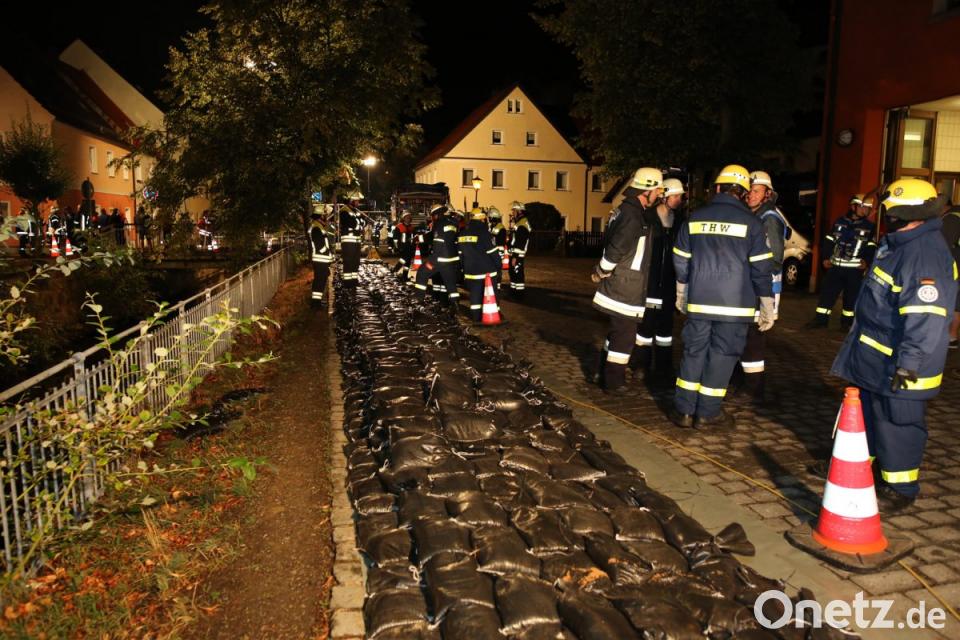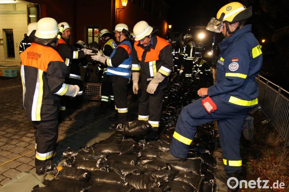 Kräfte der Feuerwehr und des THW errichten gemeinsam eine Schutzmauer aus Sandsäcken.