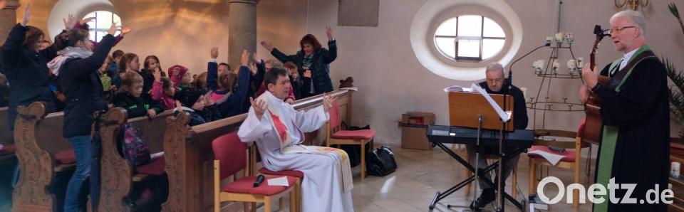 Wieder war der Pfarrsaal voll belegt. Nach einem Imbiss mit Brezen und Wienerln ging es zur Abschlussandacht in die evangelische Pfarrkirche St. Johannes Baptista. Dort war der Altarraum mit einem großen Tuch als Fisch mit den selbstgebastelten Taschen, auf denen ein Fisch und der Name des Kindes zu sehen war, künstlerisch gestaltet. Nach dem Glockengeläut stimmten Klein und Groß in das Lied „Einfach spitze, dass du da bist" begleitet von Kantor Andreas Kunz am Keyboard und Pfarrer Wilfried Römischer mit der Gitarre ein. Nach dem Lied „Großer Gott wir loben dich", segneten die beiden Pfarrer Kinder und Gläubige.