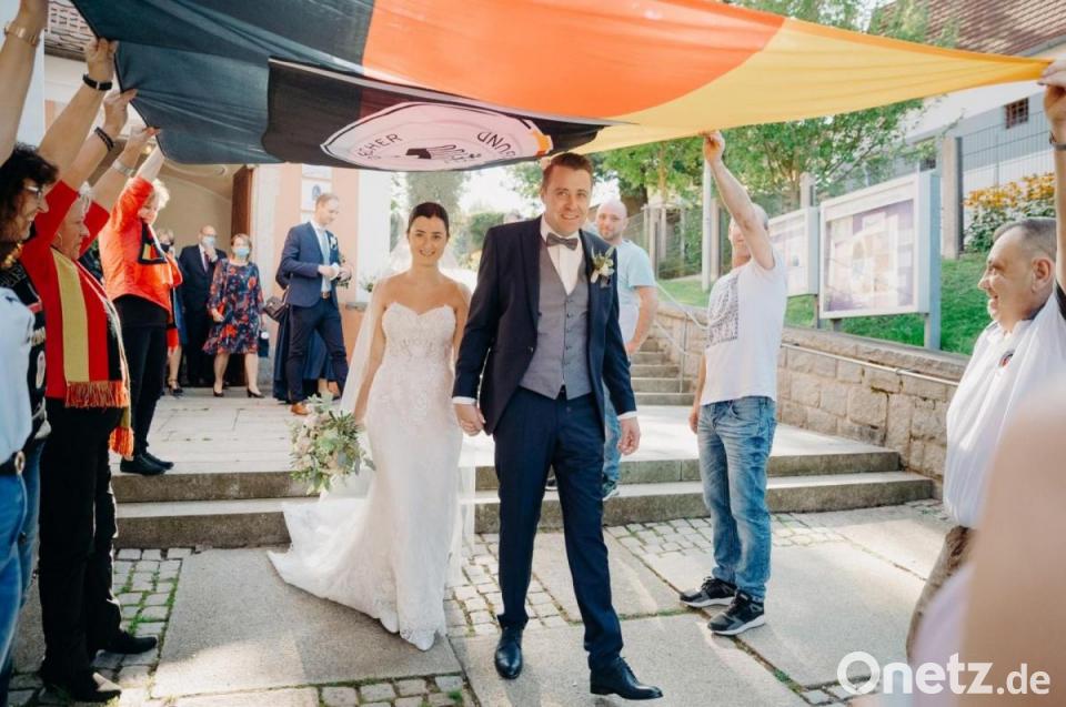 Beim Auszug standen bereits die Arbeitskollegen der Braut, die als Senior Assistentin bei Projekt-HLS arbeitet, mit einem Sektempfang Spalier. Der Deutschlandfanclub Flosser Adler wünschte seinem Gründungsmitglied und ehemaligen Vize-Präsidenten und seiner Frau mit Fahne und Spalier alles Gute. Anschließend feierte die Gesellschaft man im „Elements“ in Weiherhammer.