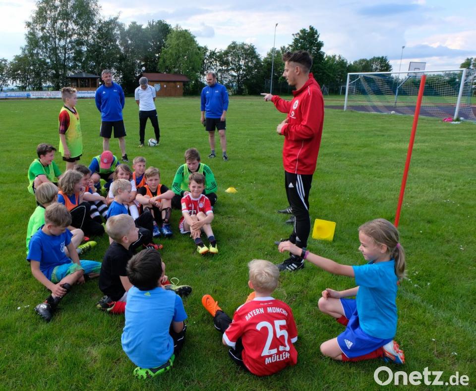 Ende gut, alles gut. Prima eingeschlagen hat bei den F- und E-Schülern des Sportvereins das Training mit dem DFB-Team, worüber sich auch Vorsitzender Alexander Meier ( stehend, links ) mit den Betreuern Stefan Kraus ( stehend, Dritter von rechts ) und Michael Gailitzdörfer (stehend, Zweiter von links) freuten.