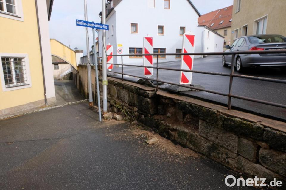 Abgesichert wurde der vor wenigen Wochen aufgetretene Schaden an der Stützmauer bei der Straßenabzweigung Bergstraße-Rabbiner-Joseph-Schwarz-Platz, unmittelbar an der Synagoge. Straßenbaulastträger ist der Markt Floß. Ihm fällt deshalb die Behebung des Schadens und damit die Erneuerung der aus Granitsteinen bestehenden Stützmauer zu.