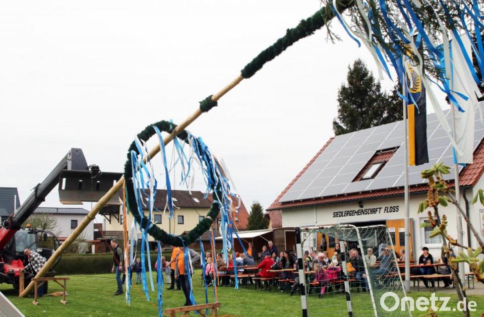 Kurz nach 14 Uhr hievte der Kalmreuther Fuhrunternehmer Max Krichenbauer mit seinem Kran den 19 Meter Maibaum unter tatkräftiger Unterstützung der Siedler in die Höhe. E