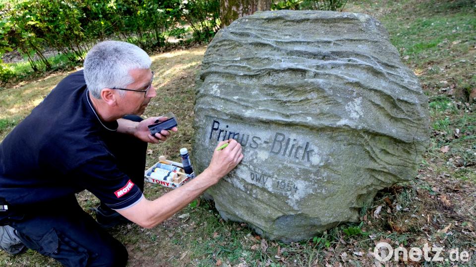 Vorsitzender Karl Kraus konnte sich auf einen festen Stamm von Mitarbeitern verlassen. Sie legten kräftig Hand an, säuberten mit Rechen, Handmäher und Rasenmäher den gesamten Anlagenbereich von Unkraut und altem Laub, schnitten den eingrenzenden Zaun auf sichtbare Höhe und sorgten für ein sauberes Umfeld. In der Anlage, die dem früheren Ehrenbürger der ehemaligen Gemeinde Schönbrunn, Oberlehrer Primus Schellein gewidmet ist, hatte Kraus die Inschrift im Gedenkstein aus dem Jahr 1954 mit dunkler Farbe aufgefrischt. Sanierungsbedürftig waren auch die beiden Ruhebänke. Selbst der große Wegweiser von der Abzweigung der Kreisstraße NEW 20 zum Primusblick bedurfte einer Sanierung. Werner Löw, Karl Kraus und ein weiterer Helfer machten sich mit Traktor, Säge, Rechen und neuen Schrauben an die Arbeit. Sie befestigten alle lockeren Hinweisschilder und Wegweiser und schnitten anliegende Äste für einen freien Blick aus.