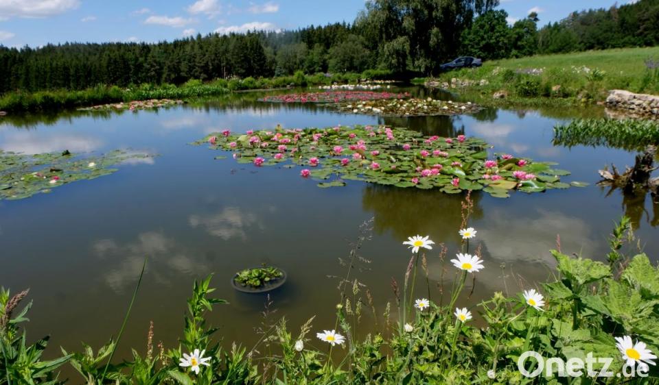 Roswitha Sollfrank hegt und pflegt die Blütenpracht auf der über 400 Quadratmeter großen Wasserfläche. Blühende Schwertlilien, Wasser-Iris oder auch Schwanenblumen bereichern mit den vielen bunten voll entfalteten Seerosen den Ausblick. Quakende Frösche und eine Vielzahl surrender Insekten verzaubern den Spaziergänger beim Rundgang um das Idyll.