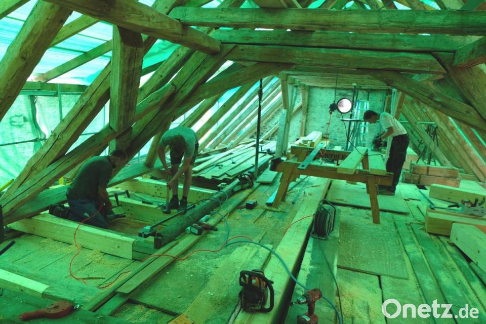 Die Sanierung des Kirchleins St. Nikolaus wird fortgesetzt. Unter einer riesigen Sicherheitsplane, mit der der Dachstuhl abgedeckt ist, wird fleißig gewerkelt. Die für den Bau zuständige Firma aus Teunz ist dabei, die notwendigen Ausbesserungen im Gebälk des Gotteshauses fachgerecht auszuführen.