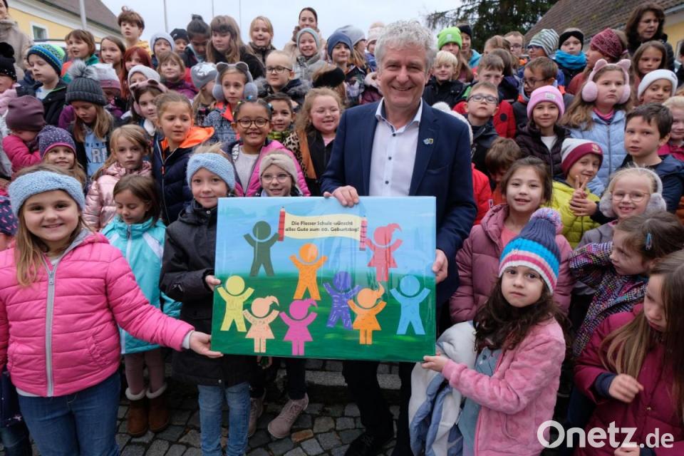 Die Kinder der Grund- und Mittelschule, voran mit Rektor Herbert Kraus und Konrektorin Gunda Hartinger mit dem Lehrerkollegium nahmen eine Sonderstellung ein. Sie wünschten mit ihren gesungenen Liedern: „Wie schön, dass du geboren bist“ und „Happy Birthday“ dem Rathauschef alles Gute. Die Überraschung neben den Blumen und Geburtstagsbild war, dass alle ausländischen Kinder in ihrer Landessprache die Lieder vortragen durften.