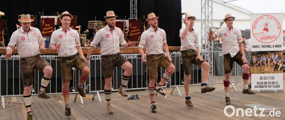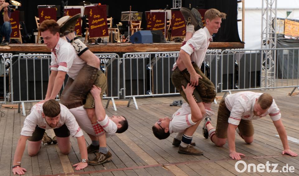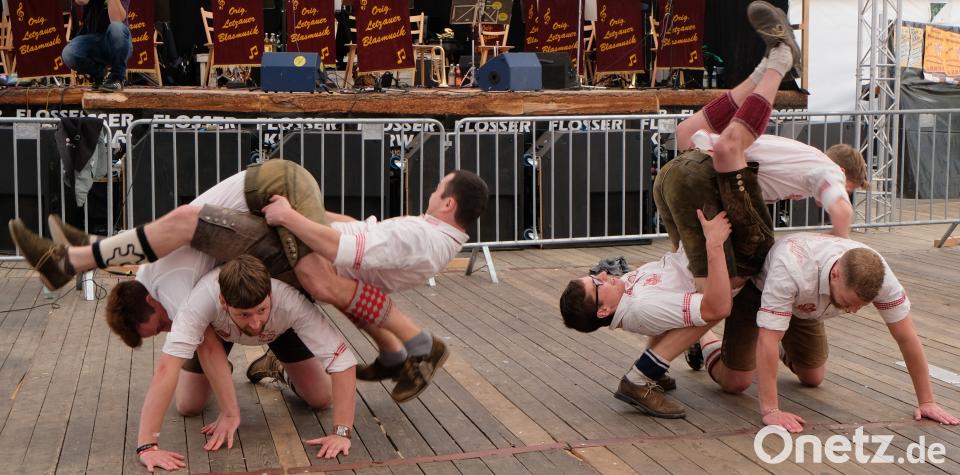 (le) Am Nachmittag war Showtime im Festzelt bei der Flosser Kirwa: Die „Neidaffer Plattler" stellten im wahrsten Sinne des Wortes einiges auf die Beine. Als es hieß „Wir plattln bis zum Hangover" war im Festzelt bereits die Hölle los. Die Letzauer Blasmusik hatte das Stimmungbarometer bereits nach oben getrieben. Die Gaudiburschen mit Moderator Tobias Hero an der Spitze gaben alles. Sie plattelten zu Melodien von Hubert von Goisern, Andreas Gabalier oder Helene Fischer. Hero musste die Zuschauer, darunter viele Familien, nicht groß aufzumuntern. Schnell standen die Gäste auf den Tischen und Bänken, sangen und klatschten mit und ließen die Neidaffer hochleben. Hero brachte es auf den Punkt: „Ein tolles Publikum, das mitmacht. Das bringt uns auch zur Höchstleistung."
