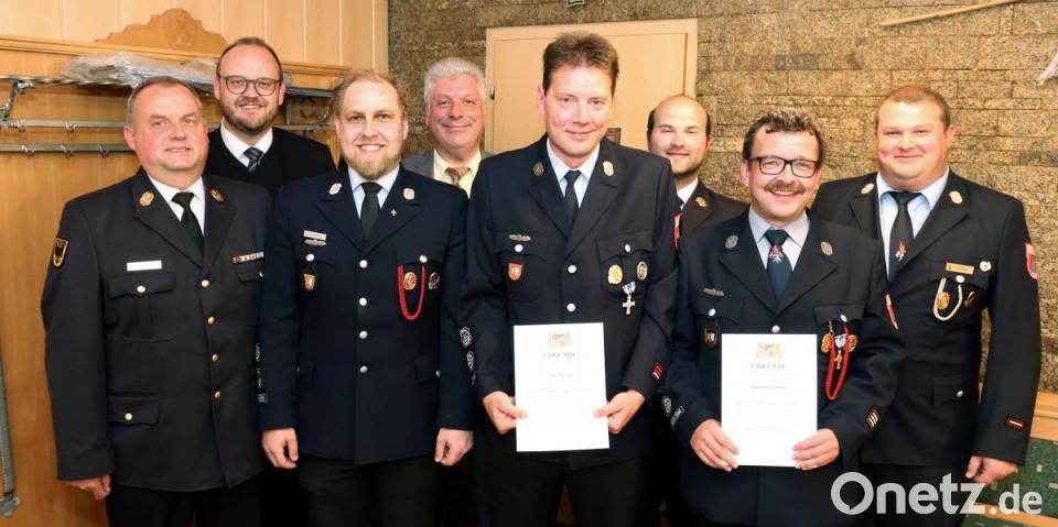 Der Landrat überreichte das staatliche Feuerwehr-Ehrenzeichen in Gold für 40-jährige aktive Dienstzeit an Manfred Lindner. Für 25 Jahre ging das Ehrenzeichen in Silber an Timo Kraus. Den Glückwünschen schlossen sich die Vertreter der Landkreis-Feuerwehrspitze und der Flosser Wehr an.