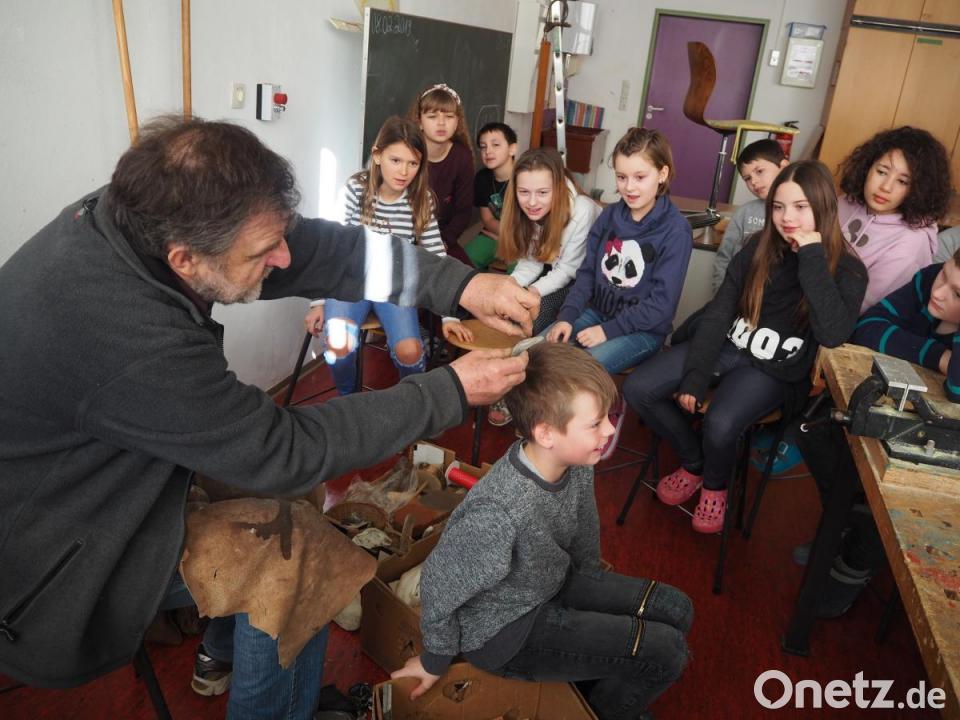 In den anschließendes Workshops probierten die Schüler selbst einen Steinzeitbohrers oder ein Steinzeithandy, das sogenannte Schwirrholz aus. Sie stellten Pfeile mit echten Federn her, schliffen Muscheln für eine Kette oder modellierten unbearbeiteten Ton, wie er in der Jungsteinzeit verwendet wurde. Mit künstlerischem Geschick verzierten die Fünftklässler ihre Pfeile und Schwirrhölzer mit Farben, wie sie früher schon bekannt waren.