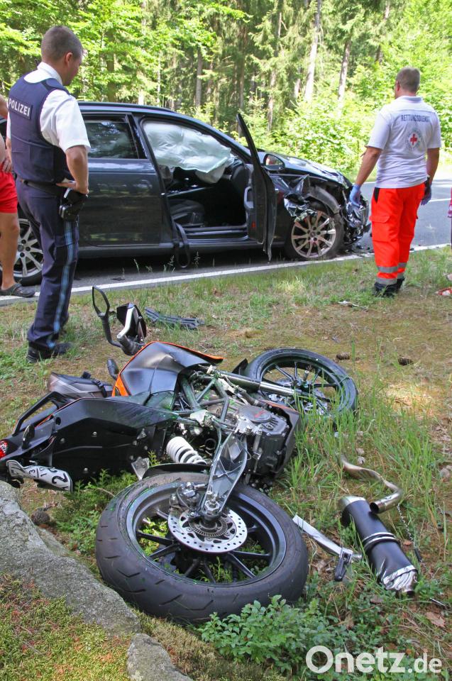 (nm) Ein abruptes Ende nahm die Fahrt eines 16-jährigen Neustädters von der Silberhütte in Richtung Flossenbürg. Die Polizeibeamten vermuteten in nicht angepasster Geschwindigkeit die Ursache für den schweren Unfall. Der Fahranfänger geriet am Donnerstag kurz vor 11 Uhr mit seiner Enduro in einer langgezogenen Rechtskurve auf die linke Seite der Staatsstraße. Eine entgegenkommende Flossenbürgerin, sie wurde leicht verletzt, hatte mit ihrem Audi keine Chance auszuweichen. Ihre mit im Auto sitzende Tochter blieb bei dem heftigen Zusammenprall unverletzt. Gravierende Verletzungen, unter anderem mehrere Knochenbrüche, zog sich der Zweiradfahrer zu. Er wurde vom BRK versorgt und mit dem Rettungshubschrauber in das Weidener Klinikum gebracht. Auf rund 30 000 Euro beläuft sich nach Auskunft der Polizei der Sachschaden. Die Feuerwehr kümmerte sich um die Verkehrsregelung und half bei der Versorgung des Verletzten.