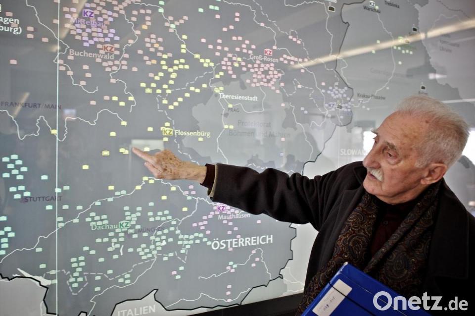 Leon Weintraub zeigt die Lager, in denen er inhaftiert war, auf einer Karte. Der aus Lodz stammende Jude lebt in Stockholm.