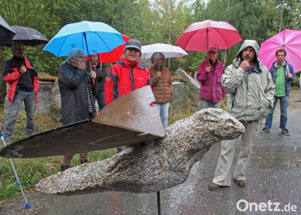 Das galt auch für den Schlusspunkt. Zunächst machten sich Gastgeber und Gäste, unter ihnen Bürgermeister Thomas Meiler, die Geschäftsführerin der Granitwerke Baumann Winnie-Anna Hauser und Angela Baumann, aber auf zum Rundgang. Vom strömenden Regen ließ sich niemand beeindrucken, viel zu spannend fielen die Hinweise und Gedankengänge der Künstler aus. Das reichte vom "Würfel mit Überraschungen“ über den „Schmetterling“ bis hin zu einem unvollendeten Werk. „Ich hätte schon Lust, noch ein wenig herumzuklopfen“, schmunzelte die Autorin.