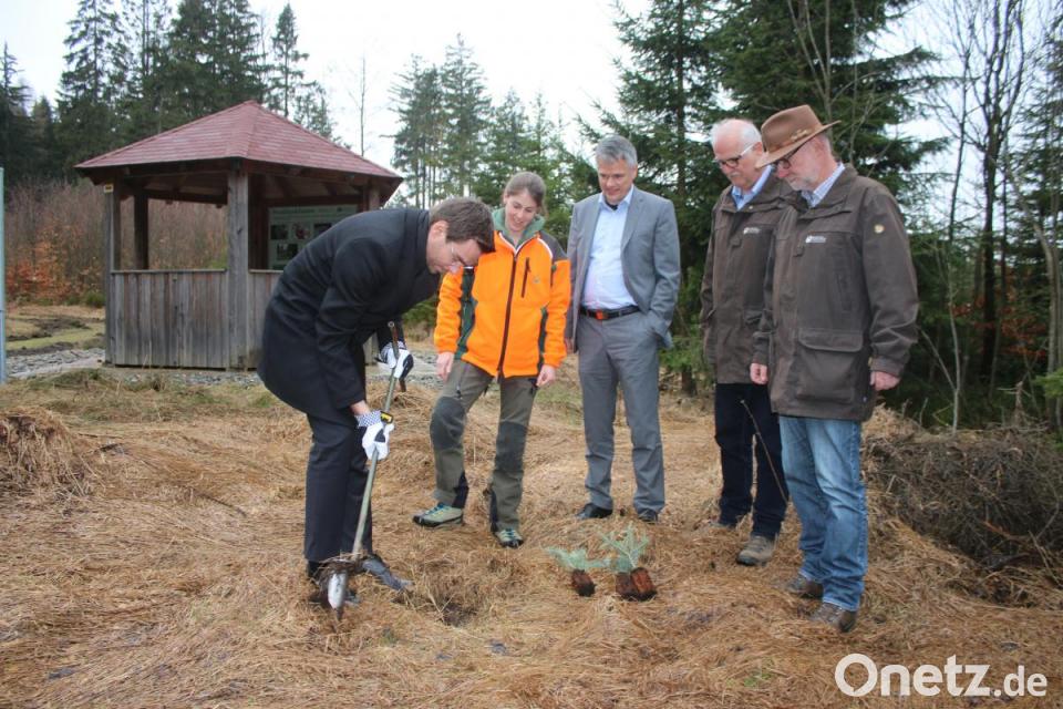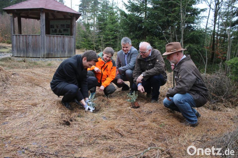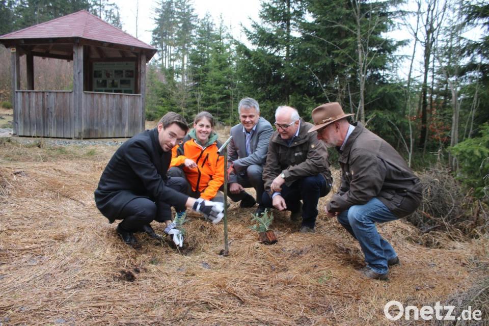 Landtagsabgeordneter Stephan Oetzinger (links) pflanzt eine junge Weiß-Tanne. Forst-Referendarin Anna Meindl (von links), Bürgermeister Thomas Meiler, Forstbetriebsleiter Stefan Bösl und sein Stellvertreter Ingo Greim beaufsichtigen ihn.