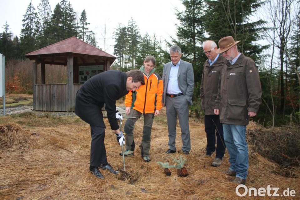 Ein Politiker der anpackt. Landtagsabgeordneter Stephan Oetzinger (links) hebt ein Loch zum Pflanzen der jungen Weiß-Tanne aus. Forst-Referendarin Anna Meindl (von links), Bürgermeister Thomas Meiler, Forstbetriebsleiter Stefan Bösl und sein Stellvertreter Ingo Greim beaufsichtigen ihn.