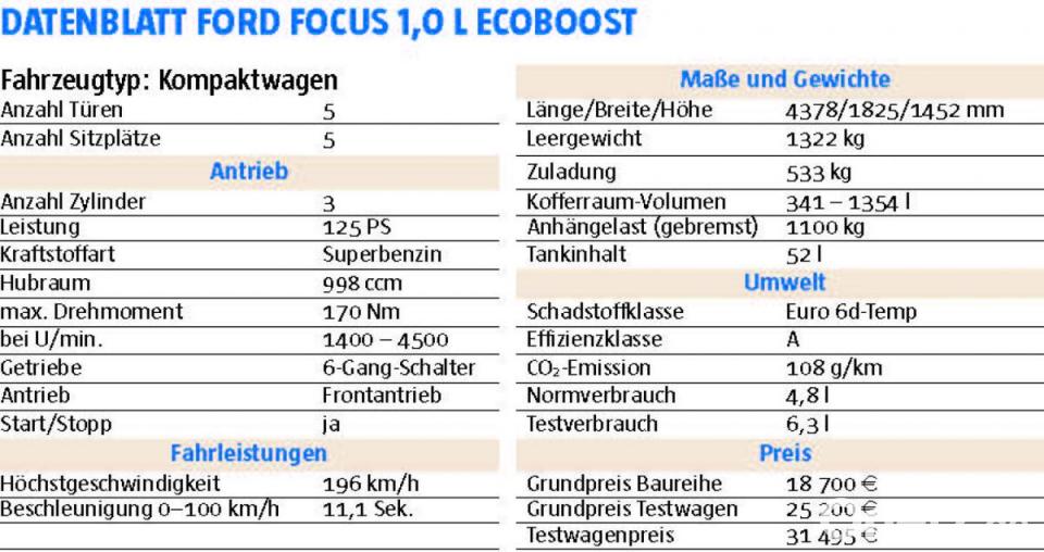 Den Standardsprint erledigt er in 10,1 Sekunden. Noch wichtiger in diesen Tagen: der Verbrauch. Um die sechs Liter waren es bei unserem Test, der Stadt/Land/Autobahn-Strecken beinhaltete. Windschattenfahrer erreichen vielleicht sogar den Prospektwert von 4,7 Litern. Mit einer Einstufung nach Euro 6d-Temp ist der Focus zukunftssicher, und er emittiert nur etwas mehr als 100 Gramm CO2 pro Kilometer. Der Titanium hätte früher bei Ford vermutlich "Ghia" geheißen, denn das waren die gut ausgestatteten Ford. In unserem Fall sind das u.a. der schlüssellose Zugang, Tempomat, Klimaanlage, Parkpiepser und Alu-Räder. Auch an Bord: das Sync3-Navi mit AppLink. Das wirkt im Vergleich zu modernen Systemen ein wenig begriffsstutzig - vor allem bei Spracheingabe - und holt langatmig aus, wenn es darum geht, die Optionen zu erklären. Ford sitzt in Köln.
