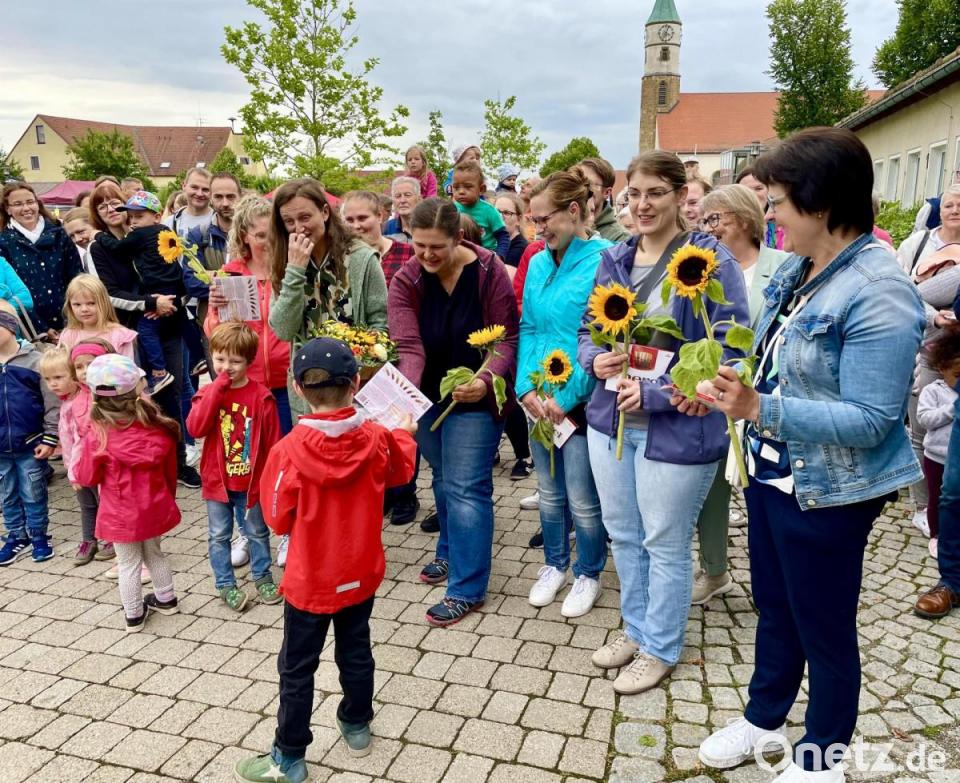 Auf dem Vorplatz der Schule hatte sich zu dem Fest eine große Anzahl an Eltern und Schülern versammelt. Julia Stiegler bedankte sich bei den mithelfenden Eltern: "Einen so engagierten Elternbeirat habe ich bisher nirgendwo erlebt. Immer wieder sorgt er im Pausenhof für neue Überraschungen." Die Kinder überreichten als Dank an die Beiratsmitglieder Sonnenblumen und Süßigkeiten.