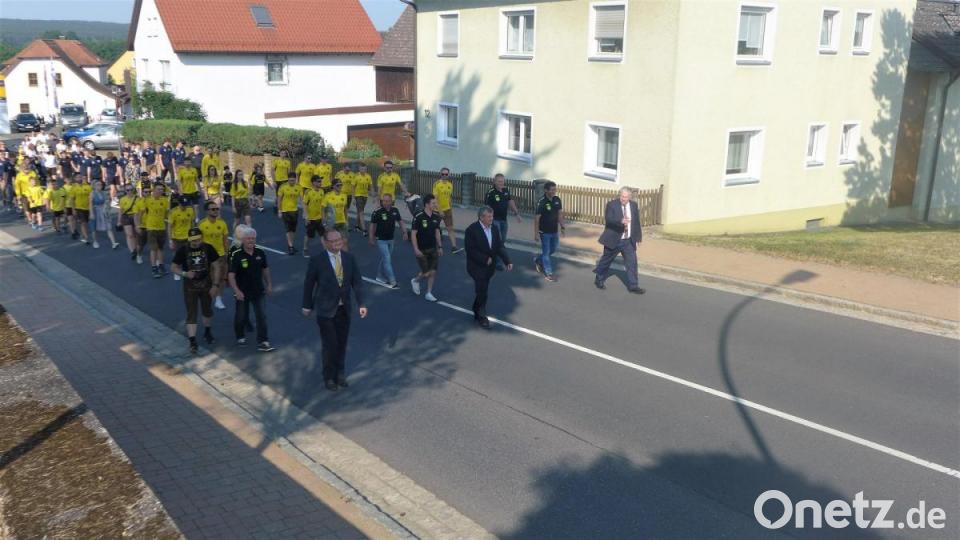Der Festsonntag zum 100-jährigen Bestehen stand in Freihung ganz im Zeichen des FC und seiner Abteilungen. Der Tag begann mit einem imposanten Kirchenzug, in den sich rund 330 Mitglieder von zwölf Vereinen aus der Marktgemeinde einreihten. Angeführt wurde er von Landrat Richard Reisinger, Bürgermeister Uwe König und Vorsitzendem Jürgen Grundler, musikalisch begleitet von der Blaskapelle Gebenbach. Vom Feuerwehrhaus ging es zur katholischen Kirche, wo Pfarrer Benny Joseph den Gottesdienst im Gedenken an die verstorbenen Mitglieder abhielt. Ein Frühschoppen mit Weißwurstfrühstück sowie das Mittagessen schlossen sich an.