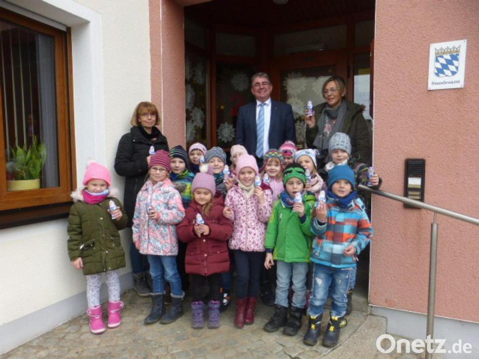 Bürgermeister Norbert Bücherl bedankte sich bei den Kindern und den Erzieherinnen mit einer süßen Überraschung für den schönen Fensterschmuck. Das Rathaus ist während der Adventszeit montags bis freitags jeweils um 18 Uhr Ausgangspunkt für den Lebendigen Adventskalender in Freihung. Die Bevölkerung ist dazu eingeladen.