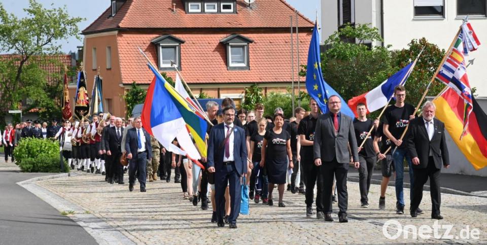 Die örtlichen Vereine wie Feuerwehr, Soldaten- und Reservistenkameradschaft, Schützenverein und eine Abordnung des 18. CSSB zogen im Festzug zur Kirche, wo Pfarrer Benny Joseph und Pater Günther aus Plasy den Festgottesdienst für Frieden und Versöhnung zelebrierte. Hartmut Schendzielorz dankte allen Teilnehmern an der Projektwoche aus Tschechien, Frankreich, Polen und Deutschland sowie allen Verbänden und Vereinen, die sich bei den Feierlichkeiten eingebracht haben.
